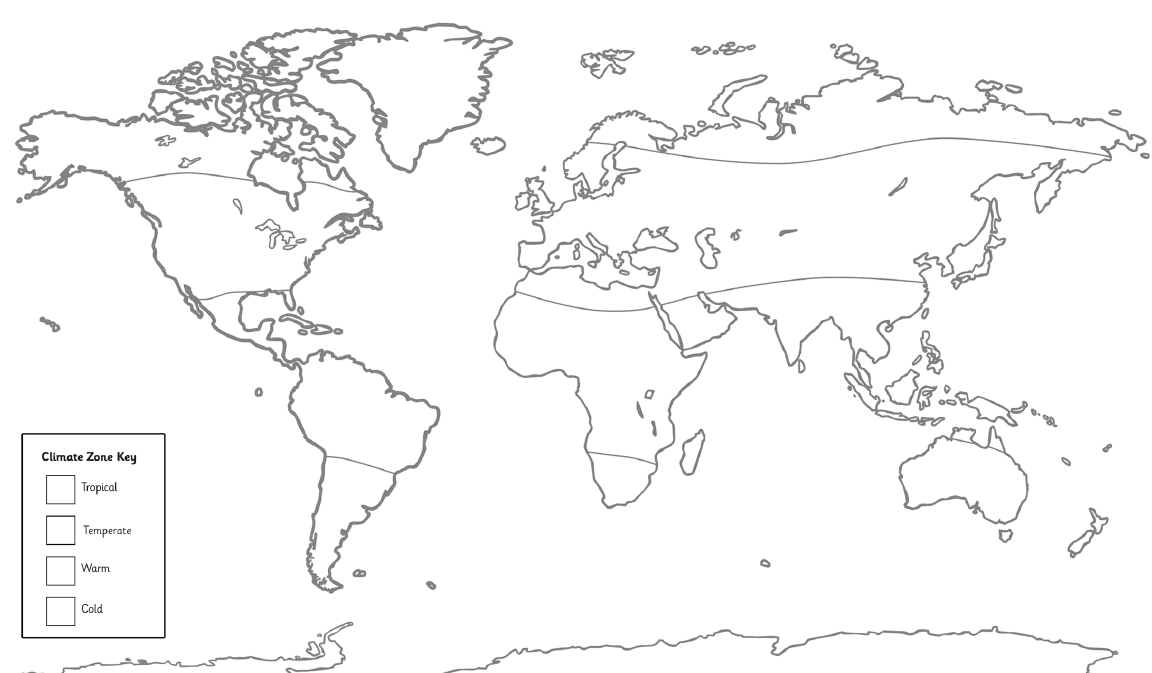 Uczniowie przyjrzą się następnie, czym jest klimat i jak jest związany z pogodą. Poznają nazwy różnych klimatów na świecie i przedyskutują, dlaczego są one różne. Po dyskusji uczniowie stworzą mapę pokazującą różne klimaty świata z kluczem. Zlokalizują na mapie kraj ojczysty, Wielką Brytanię i omówią jej klimat (umiarkowany).